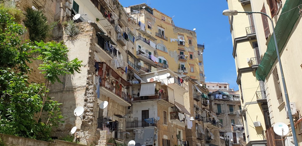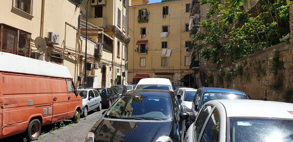 Quand nous nous rendons à Naples, nous ressentons un sentiment de liberté. La ville est bouillonnante et un peu folle, une anarchie organisée : des usagers de deux-roues sans casque, des voitures garées un peu partout, en simple, en double, voire en triple file, et au milieu de ce désordre déambulent trois policiers dépenaillés, chacun avec une façon différente de porter son arme à la ceinture.