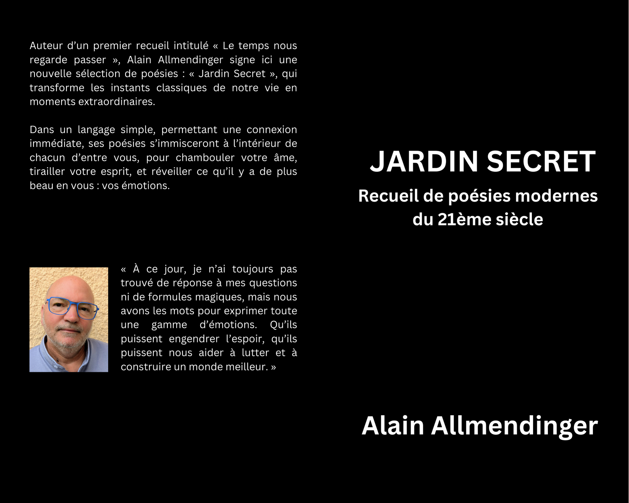Auteur d’un premier recueil intitulé « Le temps nous regarde passer », Alain Allmendinger signe ici une nouvelle sélection de poésies : « Jardin Secret », qui transforme les instants classiques de notre vie en moments extraordinaires.